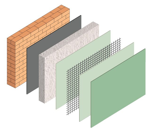Sistema di isolamento termico a cappotto con rasante termico in pasta pronto all’uso e rivestimento termico a base di fibre di carbonio, aerogel e microsfere di vetro.