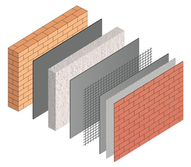 Sistema di isolameno termico a cappotto con pannello isolante in EPS e rivestimento decorativo modulare di Klinker.